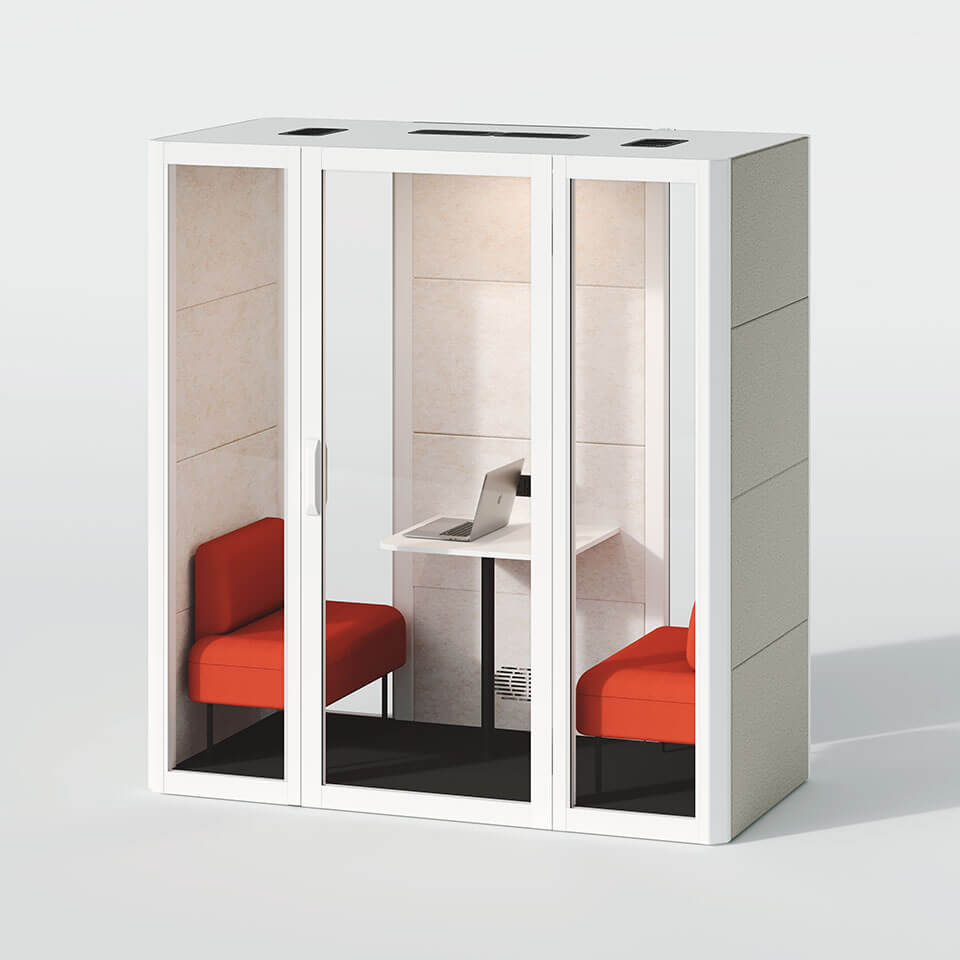 The new Qyos 200 cabin from Activo is a work, concentration and meeting space with capacity for 2 people. Silence contributes to people’s well-being: it increases creativity and learning, as well as reducing stress levels. The Qyos booths are not just another element of the office, they are a change in mentality.