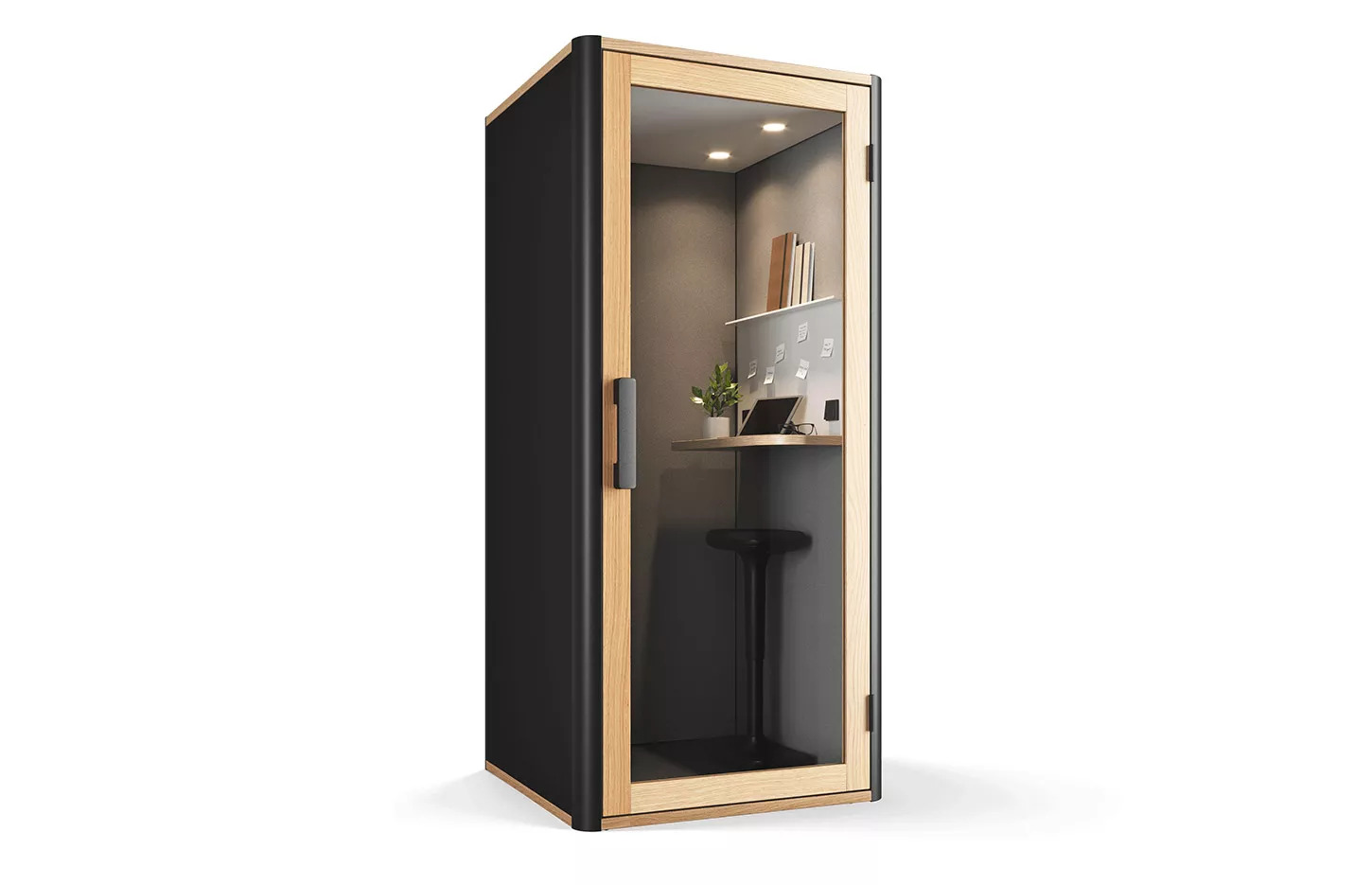 The Tahoe Acoustic Booth by France Bureau offers an exceptionally compact office solution. Distinguished by its modern design, it combines high-quality wood and metal for a sleek aesthetic. The interior is thoughtfully equipped to create a cozy and practical space. Its clever features enable efficient work in a serene environment, providing a quiet bubble away from the external hustle and bustle.