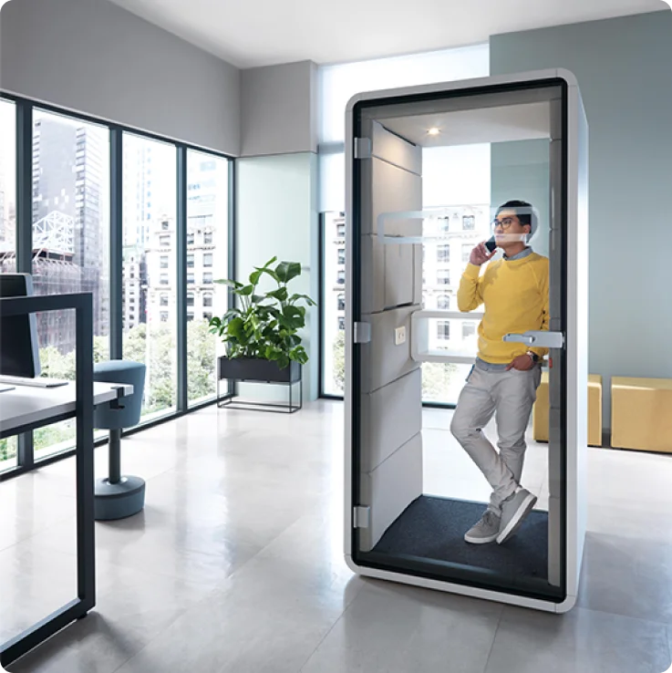 The hushPhone space is designed to be comfortable and easy to use. The lights and ventilation are motion-sensitive. They switch on automatically when you enter the booth and switch off when you leave it. The cabin space is optically enlarged by glass panels that provide space and access to daylight. “Total airflow 2 fans 80 m3/h*, 90 sec.**