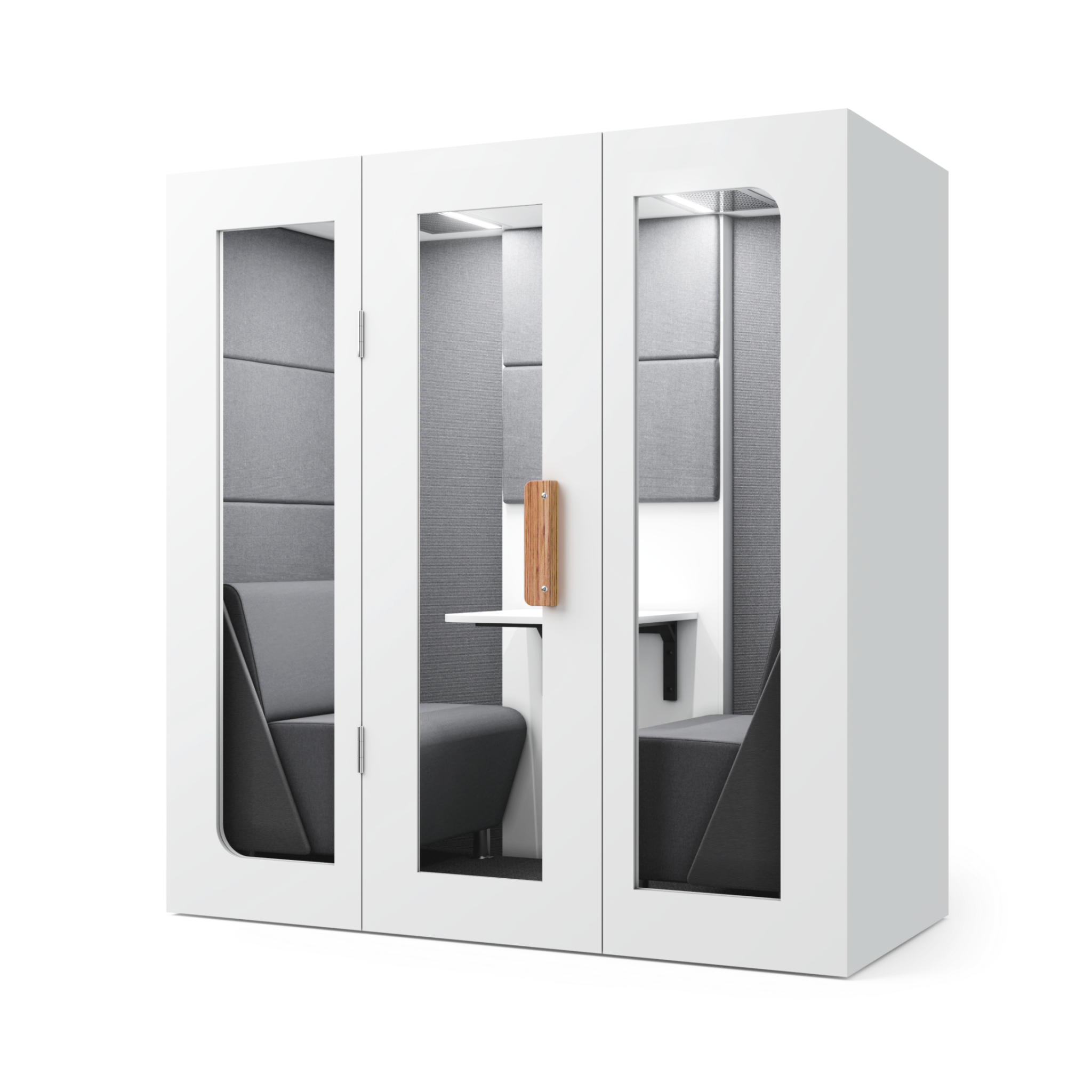 Die Silentbox® Duet Lite Bürokabine ist ideal für Telefonate, Videokonferenzen und die Kommunikation mit Kollegen. Der bequeme Tisch und die Sofas bieten eine angenehme Arbeitsumgebung für längere Zeit. Es gibt zwei Optionen für die Rückwand: Wir können sie aus Stoff oder Spiegel machen.