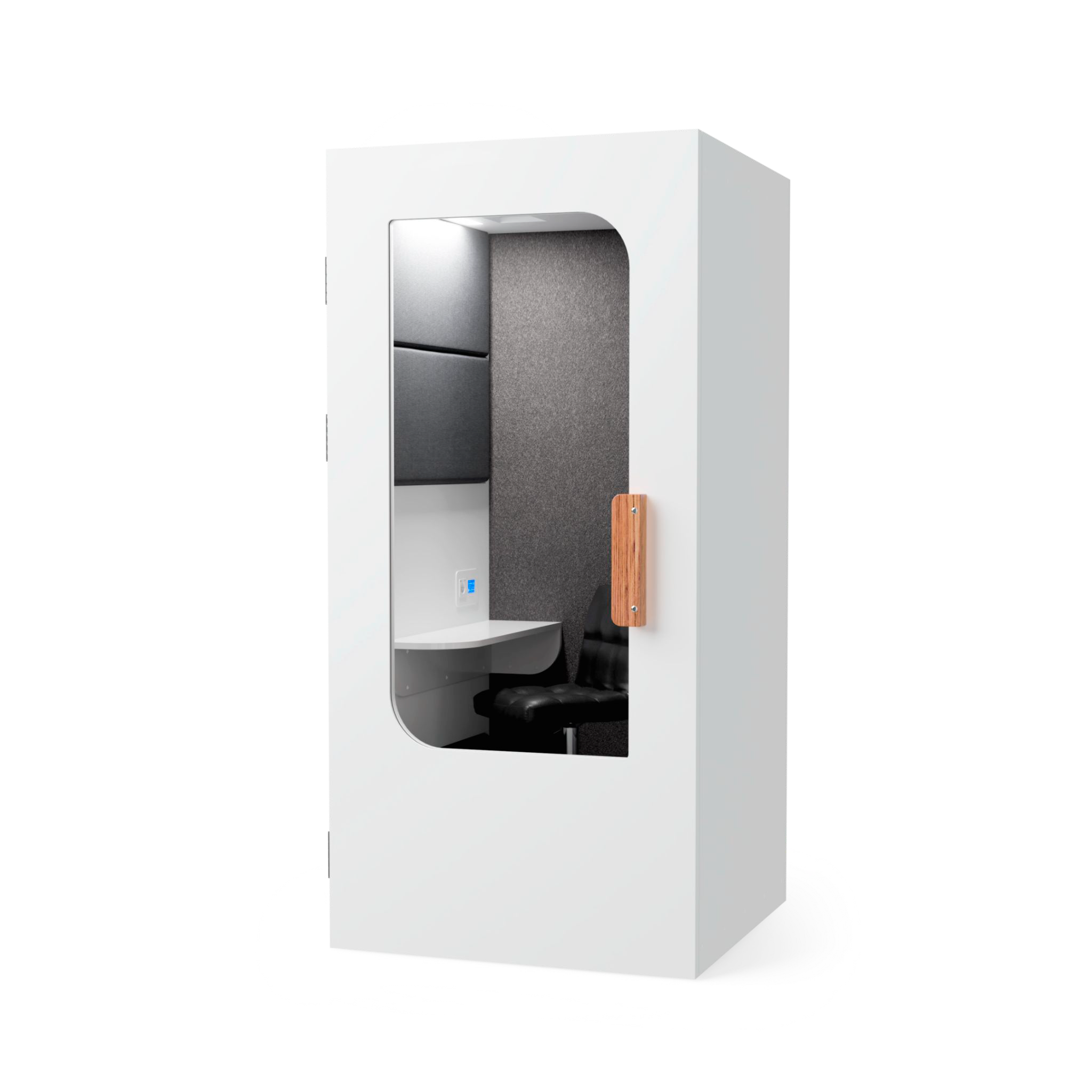 Silentbox Lite ist eine kompakte Kabine für private Arbeit oder Anrufe. Mit einer Höhe von 223 cm, einer Tiefe von 107 cm (einschließlich Griff) und einer Breite von 105 cm passt sie leicht in jedes Büro- oder Wohnraum. Die Kabine wiegt 220 kg.